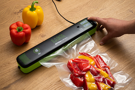 Aparatul de vidat Laica VT3104 Extra Slim Pro absoarbe aerul din pungile cu produse alimentare si apoi le inchide ermetic.